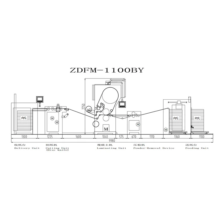 Il materiale stampato viene trasportato dal trasportatore della carta nella posizione anteriore prevista e poi introdotto. La pellicola viene alimentata dal dispositivo di alimentazione, rivestita di colla ed essiccata. La carta e la pellicola vengono pressurizzate dal rullo di riscaldamento elettromagnetico e dal rullo di compressione in gomma e quindi laminati. Tagliare la parte sovrapposta della carta utilizzando un disco tagliente o una ruota di carta abrasiva e separare la carta con il rullo tiracarta. Successivamente i prodotti finiti separati vengono inviati a un sistema automatico di ricezione e impilamento della carta in un nastro trasportatore per la raccolta dei singoli prodotti finiti.